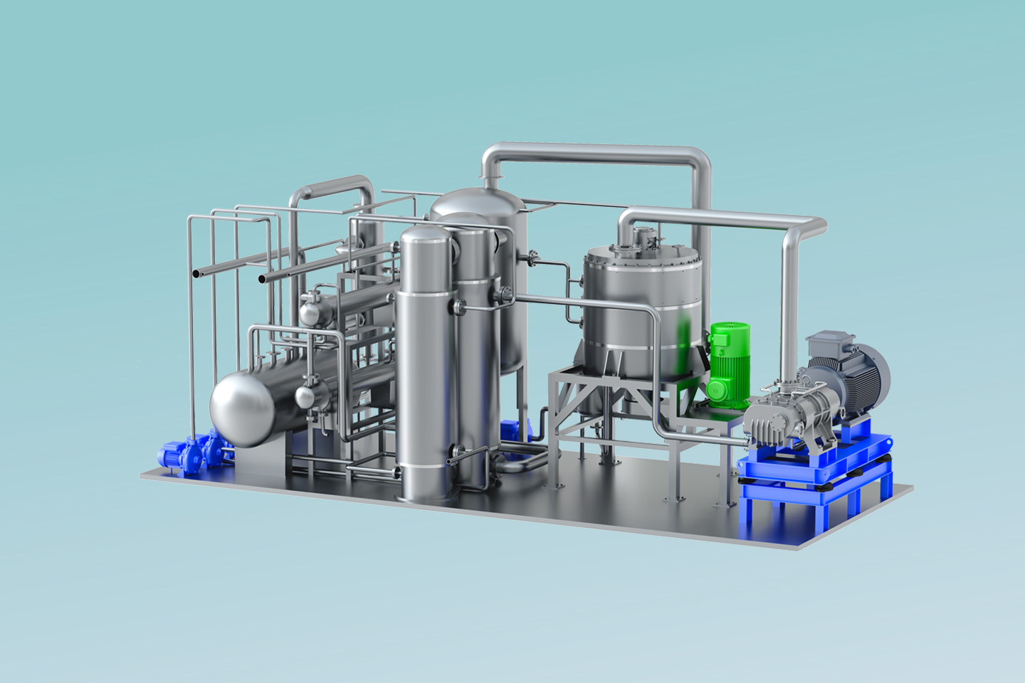 MVR热泵精馏系统以高效旋转精馏床为基础,利用离心力场代替重力场,强化相与相之间的相对速度和相互接触,通过强化传质传热来提高分离效率缩小设备体积。 通过在系统中引入适用于小流量、大压比的螺杆式蒸汽压缩机,即可实现MVR循环热泵精馏。